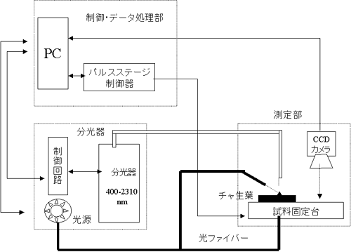- チャ生葉1枚を対象に可視・近赤外領域(400~2310nm)における吸光度を測定する分光分析装置を開発した(図1)。測定位置はCCDカメラにより取り込まれた画像上でマウスを用い任意に指定する。測定面積は直径2mmの大きさで、同時に6箇所の測定が可能である。測定の所要時間は約2分間と迅速である。反射あるいは透過のいずれかを任意に選択して吸光度の測定が可能である。
