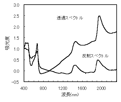 - 全波長領域で得られたチャ生葉のスペクトルは図2に示すとおり、可視領域の2箇所、近赤外領域の2箇所にピークを持つが、これ以外に顕著なピークは観察されない。