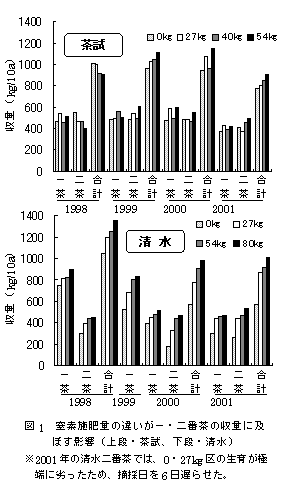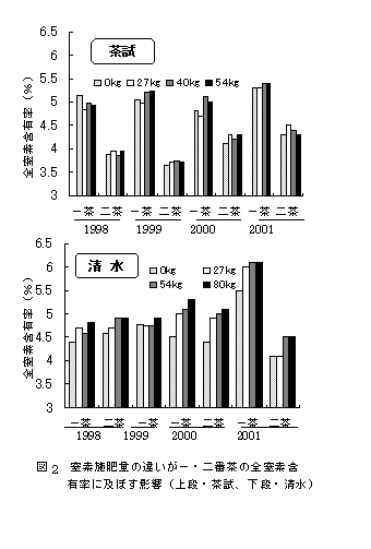 - 51~54kg区では、清水(図1)と、本川根で収量がやや低くなったものの、一、二番茶の全窒素含有率(図2)・官能審査結果(図省略)と、菊川での収量には4年目でも明確な差は見られなかった。茶試の40kg区と54kg区については、明確な傾向は見られなかった(図1、図2)。