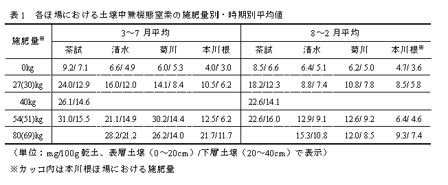 - 土壌中の無機態窒素は、表層・下層とも概ね施肥量の多い区ほど高く推移したが、施肥量差の現れ方は試験場所によって異なっていた(表1)。平均すると、各ほ場ごとに収量の高低と類似した関係が見られ、収量に関係していることが示唆された。