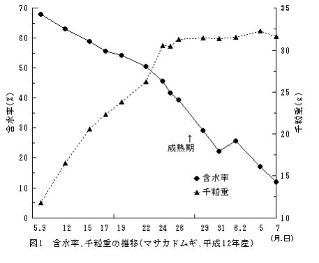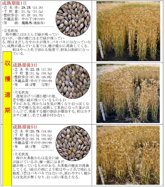 登熟期の穀粒の水分含量および外観品質の変化を明らかにするとともに、立毛状況の変化を加え「六条大麦適期収穫チャート」を作成した。これにより、六条大麦生産のためのコンバイン収穫適期が簡易に判定できる。