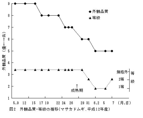 高品質六条大麦生産のためには適期収穫が重要である。そこで、登熟期における穀粒変化を明らかにし、簡易な収穫適期判定が可能となる生産現場で活用できる適期収穫チャートを作成する。