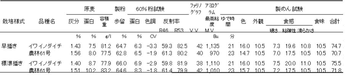 表2 早播き(10月下旬)と標準播種(11月下旬)における製粉・製めん試験結果