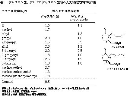 | 発表論文等 | :1)本多ら、イネ科植物の花粉飛散防止方法 (2000)、特開平11-288173 2)本多ら、ジャスモン酸類縁体の大麦開花受粉阻害活性(2000)、植化調発表記録集:27-28 |