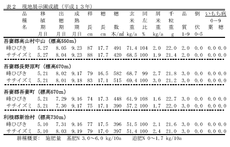 中山間地域は、いもち病だけでなく冷害の被害に見舞われる危険性が高いので、いもち病抵抗性、耐冷性に優れた「サチイズミ」が採用されている。しかし、食味評価が不十分であるため良食味でいもち病抵抗性、耐冷性に優れた新たな品種が望まれている。そこで、いもち病抵抗性、耐冷性に優れる「峰ひびき」を採用し、この地域の生産安定を図る。