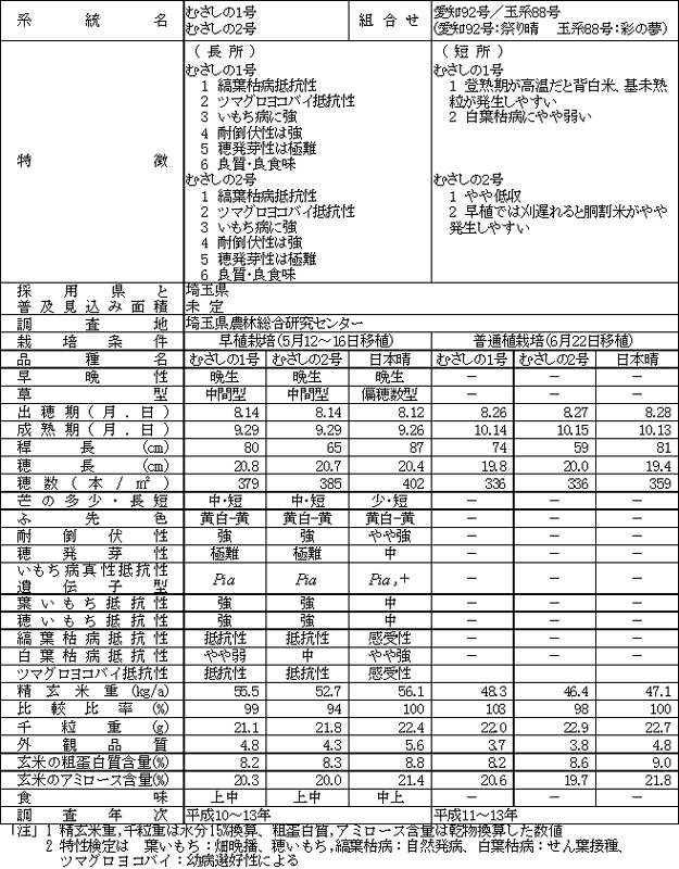 - 「むさしの1号」、「むさしの2号」は平成4年に縞葉枯病・穂いもち抵抗性、良食味の「愛知92号(祭り晴)」を母に、縞葉枯病、ツマグロヨコバイ抵抗性の「玉系88号(彩の夢)」を父として人工交配を行い育成された姉妹系統である。