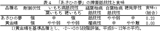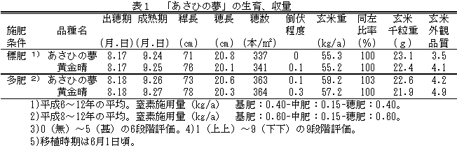 水稲「あさひの夢」は、県下平坦地の中生に属する粳品種である。良質、良食味で、穂いもちに強く、縞葉枯病抵抗性を持つ。耐倒伏性と収量性は「黄金晴」並に優れる。「黄金晴」に替えて奨励品種に採用する。