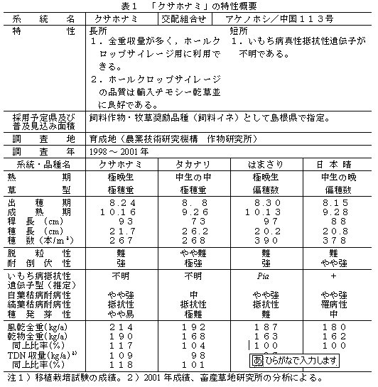 | [キーワード] | 水稲、新品種、飼料イネ、クサホナミ、稲発酵粗飼料 |