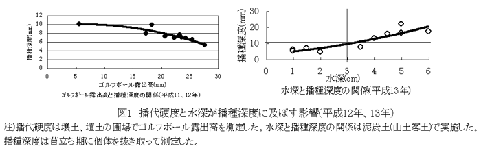 - 適正播種深度7~10mmを確保するのには、ゴルフボールを田面20cmの高さから落下させ、その露出高5~20mm程度が播代の硬さの目安である。また、播種作業時の田面水はひたひた水状態から水深3cm以下で播種する(図1)。