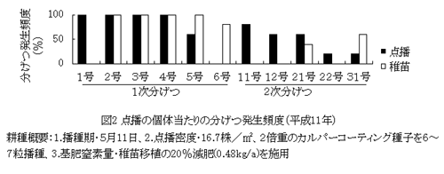 - 点播の個体当たりの分げつは、移植に比べ1次分げつ及び2次分げつとも下位節から発生し、分げつ数も多くなるため、茎数は多めに推移する(図2)。倒伏させないためには播種後40~50日頃の茎数が単位面積当たり400本を上回る場合、水管理で分げつを抑制する(データ省略)。