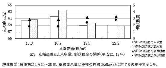 - コシヒカリの点播密度は密播ほど倒伏しやすく収量、品質が不安定になるため、30×20cm、苗立ち数は単位面積当たり60~80本程度で安定した収量が得られる(図3)。