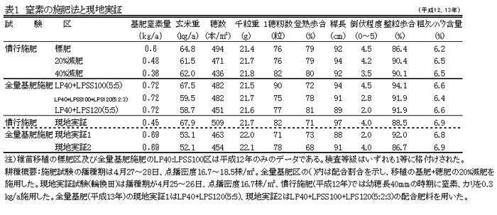 - 窒素の施肥法は一般施肥では移植の標準施肥量の40%減肥+穂肥、全量基肥施肥ではLP40とLPS120を1:1に配合した肥料がLP40、LPSS100、LPS120のブレンド肥料より適し、稚苗移植の基肥+穂肥窒素量の20%減肥相当量を施用することで安定した収量、品質が得られる(表1)。