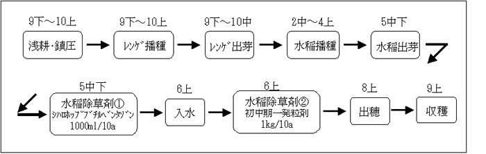 しかし、本栽培法の除草体系は、乾田期に2回、入水後に1回と合計3回の除草剤散布により成り立っており、作業の繁雑さや環境負荷の点から回数の減少に対する要望が高まっている。そこで、除草剤散布回数の減少を目的に、レンゲ立毛中への不耕起直播栽培技術の開発を行う。