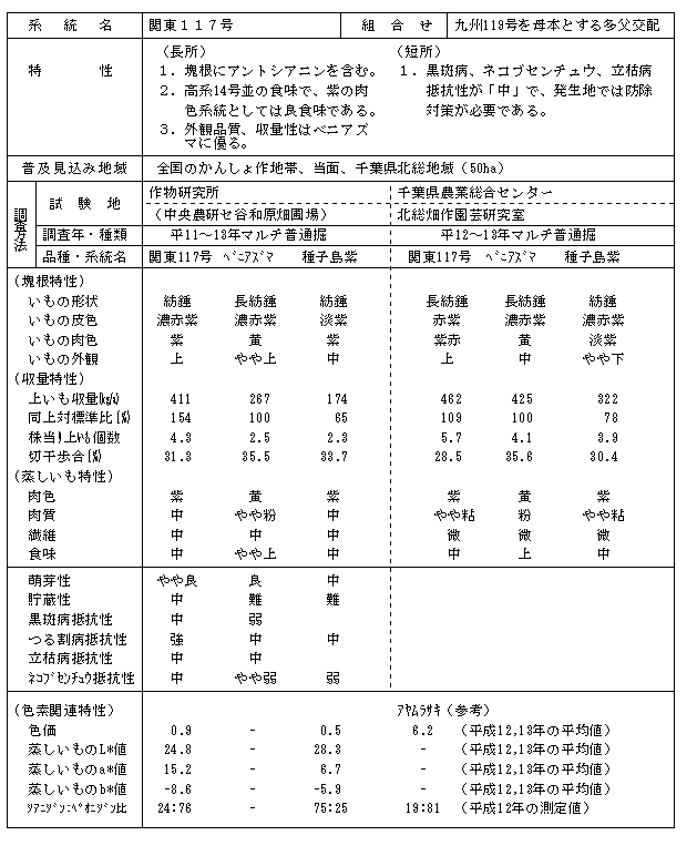 サツマイモ「関東117号」はいもにアントシアニン色素を含有する紫サツマイモの系統で、外観が優れ、いも揃いも良く、多収である。また、紫サツマイモとしては良食味の系統で、青果用としての利用が期待される。