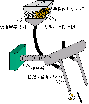 代かき・施肥・播種作業を同時に行える空気噴射式湛水直播機を利用して、被覆尿素配合肥料を打ち込み施肥することにより、施肥労力の削減が図られるとともに、コシヒカリなど倒伏に弱い品種の湛水直播全量基肥栽培が可能になる。