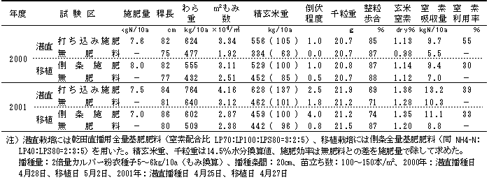 表2 空気噴射式湛水直播機を用いたコシヒカリの全量基肥栽培での生育・収量