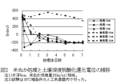 - 米ぬか処理で表層から酸化還元電位の低下が始まり、深さ1cmまでの酸化還元電位は1日後に-200mV以下にまで急激に低下する(図2)。