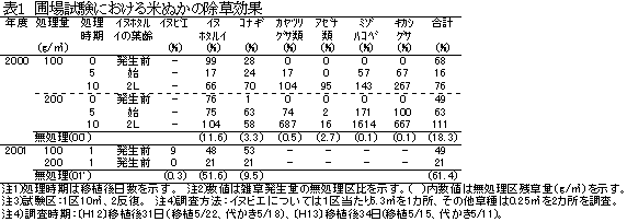 - 移植後から雑草発生始期までに米ぬかを10~20kg/a施用するとカヤツリグサ類、アゼナ類、ミゾハコベ、キカシグサの発生はほとんどみられなくなり、イヌビエの発生も抑えられる。しかし、イヌホタルイ、コナギに対する除草効果は小さい(表1)。