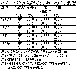 - 米ぬか処理でイヌビエの発芽率は著しく低下する。一方、タイヌビエ、イヌホタルイ、コナギでは発芽率の低下は小さいが初期生育は抑えられる(表2)。
