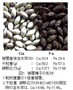 - 酸化鉄粉被覆種子は黒褐色で表面凹凸が多い。水中での崩壊は緩やかで、吸水し膨張するが剥離せず、過酸化石灰剤被覆種子より形状が長く維持される。被覆直後は含水率が高く柔らかいが、乾燥後は無人ヘリ等で播種可能な強度となる(図1)。