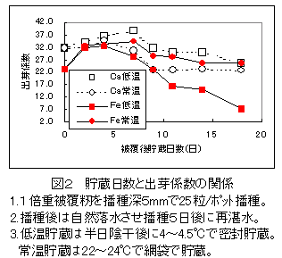 - 酸化鉄粉被覆種子は2~3日陰干しを行い、含水率15%程度に乾燥させてから播種することで出芽・苗立ちが安定し、常温網袋貯蔵でも1週間程度は保存できる(図2)。また、乾燥後に低温密封貯蔵すると高い出芽性が維持できる。