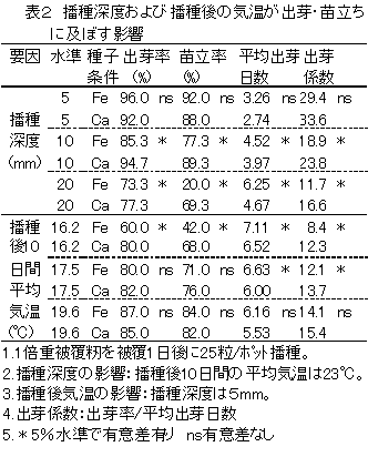 - 酸化鉄粉被覆種子の出芽性は、播種深度10mm以上では過酸化石灰剤被覆種子に劣るが、播種深度5mmでは出芽速度は遅いが同等の出芽率、苗立率が得られる(表2)。