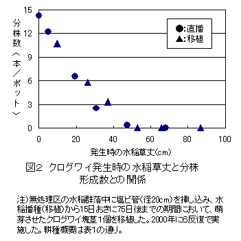 - クログワイ発生時の水稲草丈の増加にともなって、クログワイの母株から発生する分株数は減少する。湛水直播栽培では移植栽培と同様に水稲の草丈が約50cmに達すると、それ以降に発生する株からは分株を発生しない(図2)。