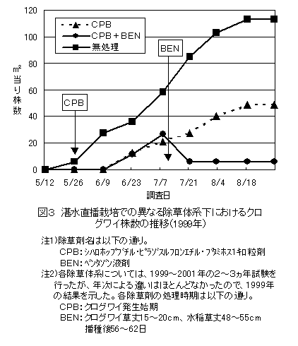 - シハロホップブチル・ピラゾスルフロンエチル・ブタミホス1キロ粒剤はクログワイの発生を処理後約3週間抑制するが、その後は株数が増加し(図3)、その効果は不十分である。