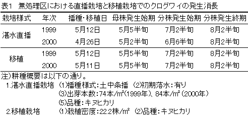 移植栽培、クログワイ、水稲草丈、増殖、制御、体系処理、湛水直播栽培 |