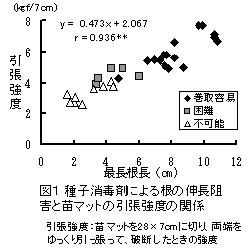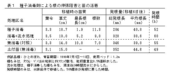 移植栽培の省力化技術として期待されるロングマット苗の育苗・移植では、育苗は水耕の循環養液中で行われるため、病害発生の助長される可能性もあり、種もみ消毒は必須となっている。しかし、種子消毒剤の中には、根の伸長阻害を示す剤が含まれ(平成12年 成果情報)、これらの薬剤を使って消毒済みで市販されている種もみもある。このような購入種子を用いた場合でも、正常に苗が巻き取れるように、根の伸長阻害を軽減する方法を明らかにする。