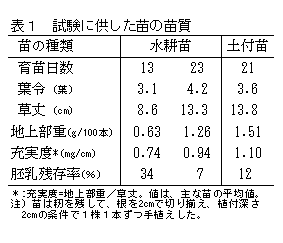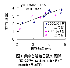 - 圃場に移植した結果から、移植時の葉令と活着日数との間に正の相関関係が認められ、水耕苗と土付苗との間に違いはない(図1)。また、活着後の生育の早さを示す出葉速度と移植時の葉令や、新しく伸びた総発根長と苗の乾物重との関係についても、水耕苗と土付苗では、同様の傾向である(データ略)。したがって、両者には、活着や初期生育について本質的な違いは認められない。