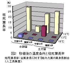 - 低温活着の指標の1つといわれる活着限界温度近傍での枯死葉長率(全葉身長に対する枯死した葉身長の割合)をみると、水耕苗の値がやや低い傾向で、水耕苗の低温活着力は土付苗に比べて劣らない(図2)。