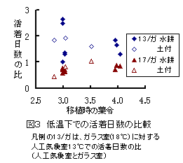 - 生育が遅延する低温下と通常条件での活着日数の比を比較すると、低温では値がややばらつくもののいずれの温度下でも葉令に関わりなく一定で、水耕苗と土付苗でも同様な値である(図3)。