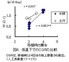 - 生育遅延温度域における乾物生産量(CGR)について、移植時の葉令との関係で検討すると、両者には正の相関関係が認められる。同じ葉令で見ると、乾物重の軽い水耕苗が土付苗よりやや生育量は劣る傾向があるものの、葉令の進んだ水耕苗では、乾物生産は旺盛となる(図4)。