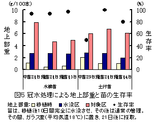 - 移植後10日間の冠水処理を行った場合、処理後の地上部重は土付苗と差はなく、生存率においても差は認められない(図5)。