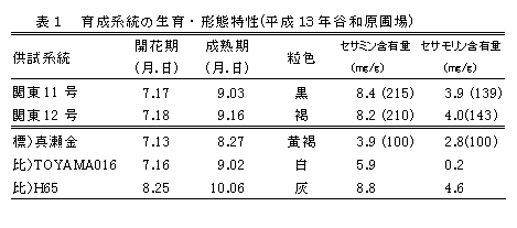 | 研究課題名 | :強抗酸化・良質・多収ごま品種の育成(平成4~12年) 高リグナン含有ごま系統を素材とした良品質系統の育成(平成13~17年) |