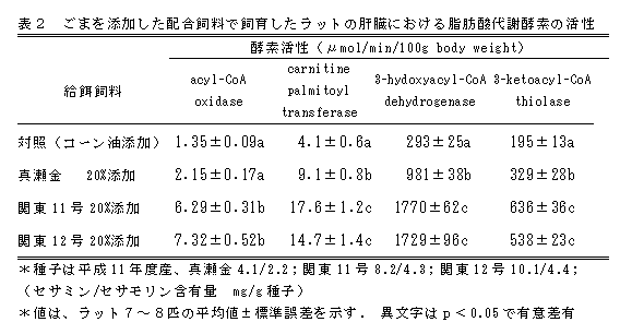 セサミン・セサモリン含有量の多い熱帯型ゴマの遺伝資源を母本として、国内で栽培可能な、高リグナン含有系統を育成した。関東11号、12号は在来系統「真瀬金」の約2倍のセサミンと、1.5倍のセサモリンを含有し、飼料に混入して飼育したラットの肝臓における脂肪酸代謝酵素活性は「真瀬金」より高くなる。国産ごまによる機能性食品開発の素材としての利用が期待できる。