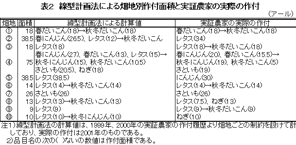 - 実証農家の品目ごとの作付配置は、病虫害の発生を抑制するために、(1)連作は回避する、(2)ネギの後作にはレタスを作付けない、(3)キタネグサレセンチュウの拮抗植物マリーゴールドかこの線虫密度低下の効果があるサトイモを3年に1回は作付ける、等の条件をできるだけ満たすように決められており、作付履歴から畑地ごとに実証農家が設定している条件を課した線型計画モデルで実際の作付配置がある程度再現できる(表2)。