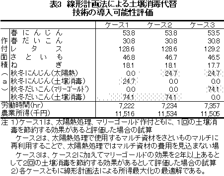 - 土壌消毒代替技術である秋冬ニンジン前の太陽熱処理および秋冬大根前のマリーゴールドの作付は土壌消毒を伴う慣行の体系と比べて生産費、労働時間が大きいが、実証農家で行っているように太陽熱処理に利用したマルチ資材をサトイモのマルチに再利用することで資材を節約し、マリーゴールドの作付に2~3年の線虫防除効果を見込んで、線形計画法で評価すると土壌消毒代替技術が選択される(表3)。土壌消毒代替技術は資材の有効利用を図ること等で経営的にも有利な技術となる。