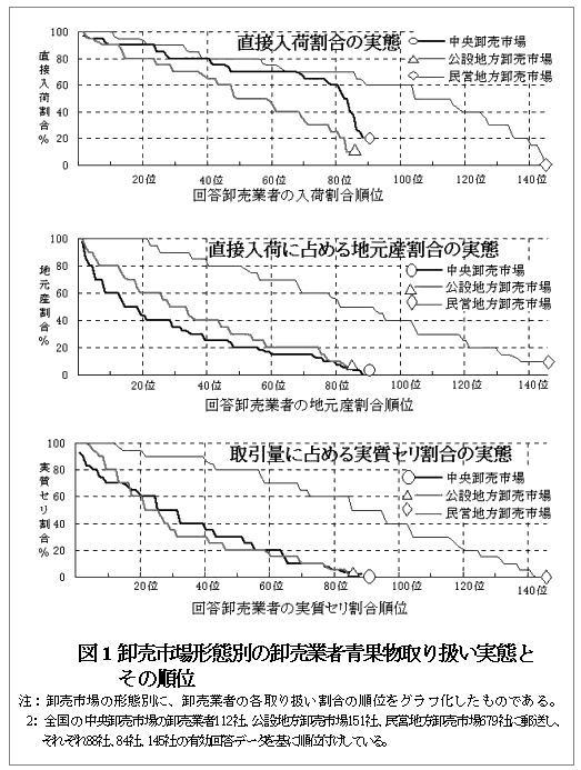 - 各項目の割合を基に、卸売市場の形態別に卸売業者を順位付けしたものが図1である。このグラフは卸売業者の全国的位置を読みとり、その差異を視覚的に捉えられる。各項目の割合とも、ほぼ100%から0%(最低直接入荷割合は中央卸売市場で20%、同公設地方卸売市場で10%)まで広く分布し、卸売業者の青果物取り扱いが多様であることを示している。