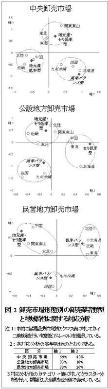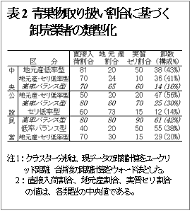 全国の青果物卸売業者を対象に青果物直接入荷割合、地元産青果物割合、実質セリ取引割合によって順位付けし、全国的位置が把握できる行政指導参考図表を作成した。また、卸売市場の形態別に卸売業者のクラスター分析などを行い、関東東山、東北に多い「地元産・セリ低率型」、四国、九州沖縄に多い「高率バランス型」など青果物取り扱いの特徴を明らかにした。