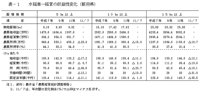 - 水稲単一経営における農業所得の推移を平成7年対11年の変化割合でとらえると、5ha以上の規模層で約30%の減少率を示している。しかし、15ha以上(平均:25.6ha)のより大規模な階層における減少率は10%前後にとどまっている。この較差要因は、大規模層では固定資本額の新たな投入を抑制し、それが経営費の減少に作用しているためと考えられる。