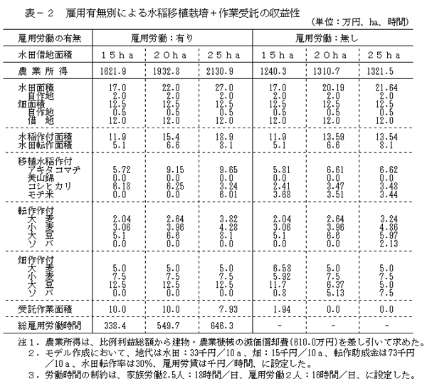 - 作業受託の導入による経営の収益性を未導入の場合に比べてみると、水田借地面積が15ha規模で380万円、20ha規模で620万円、25ha規模では810万円の収益増加が期待できる。この結果から、水稲の作業受託は、通常の家族労働に雇用労働2人/日の労働力が確保されている場合、経営面積規模がほぼ40ha(うち水田面積25ha前後)までは有利に展開しその導入効果が確認される(表2)。