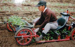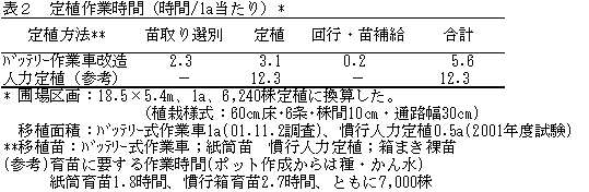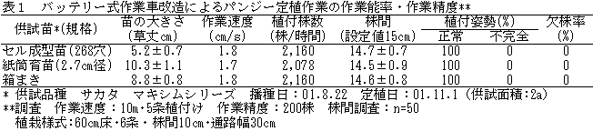 実用化されている野菜用移植機では、パンジーの植え付け条件・移植苗質から適応が困難のため、ダイコン用間引き作業車の一部を改良して、作業車に乗り能率的に定植する作業方法を開発する。