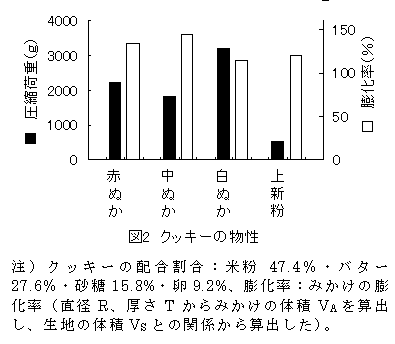 - 水の代りにバターと混ぜ合わせて加熱した場合、酒造米ぬかは膨化しほどよい硬さとなる。バター等油脂を用いる菓子として、クッキーへの利用を検討した結果、白ぬかを用いたものは硬化するが、赤ぬか、中ぬかを用いたものは「さくさく感」があり、良好である(図2)。しかし、赤ぬかのものはぬか臭がきついため、商品化には問題がある。従って、機能性成分を含み、品質が良好である中ぬかがクッキーへの利用に適している。
