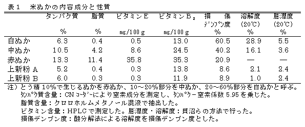 - 酒米をとう精する時に発生する米ぬかはとう精する部位により、赤ぬか、中ぬか、白ぬかの3種類に分けられる。最外層である赤ぬかはタンパク質等内容成分を最も多く含み、中ぬか、白ぬかと続く。とう精20~60%の部位から生じる白ぬかの内容成分は市販米粉(上新粉)とほとんど変わらない(表1)。