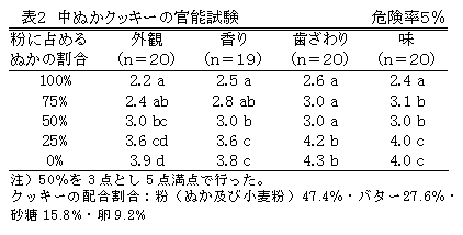 - 主原料における小麦粉と中ぬかの割合を変えて行った食味検査の結果から、中ぬかを25%を含むものは0%のものとほとんど差がなく、また、50%と75%にも違いはない。しかし、100%のものはその他のものと明かに違いが認められる(表2)。