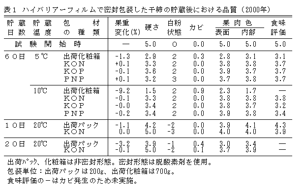 - ハイバリアーフィルム(KON、KOP、PNP)で密封包装した干柿は、5℃および10℃の貯蔵ともに、60日後においてもカビの発生がなく、白粉の状態、干柿の表面、果肉の変色がほとんどなく食味も良好に保持される。一方、非密封形態の出荷用パック、化粧箱は白粉の消失やカビの発生により、品質が大きく低下する(表1)。