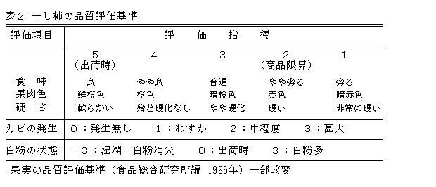 - 20℃貯蔵では、非密封(出荷パック)、密封(KON)のいずれの包装形態も貯蔵20日の時点で、干柿の表面が湿潤状態となり、白粉消失してカビが発生する(表1)。