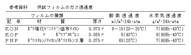 - 脱気するので包装内の残存酸素は少ないが、いずれのフィルムも若干酸素が透過するので、カビ、変色の防止対策として、念のため干柿1kg包装あたり空気量1,500cc用の脱酸素剤を封入する。